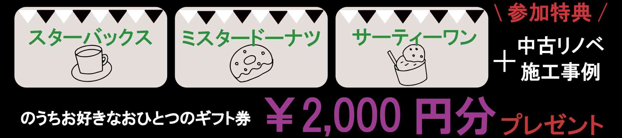 ①スターバックス ②サーティーワン ③ミスタードーナツの中からお好きな一つのギフト券2000円分をプレゼント!