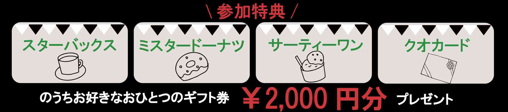 ①スターバックス ②サーティーワン ③ミスタードーナツ ④クオカード の中からお好きな一つのギフト券2000円分をプレゼント!
